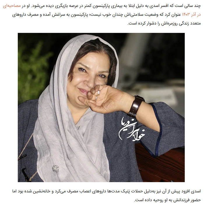 In recent years, Afsar Asadi has been battling Parkinson’s disease, a neurodegenerative disorder that affects movement, speech, and daily activities. His health deterioration has led to reduced public appearances and acting roles.