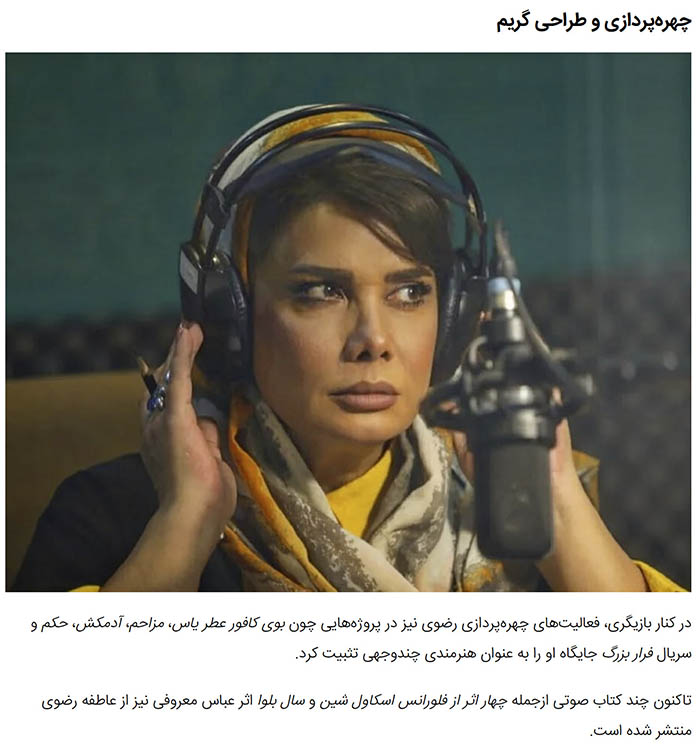 Razavi’s artistic talents extend beyond acting and makeup. She has published several audiobooks, including works by Florence Scovel-Sheen and Abbas Marouf, enriching Iranian literary culture.