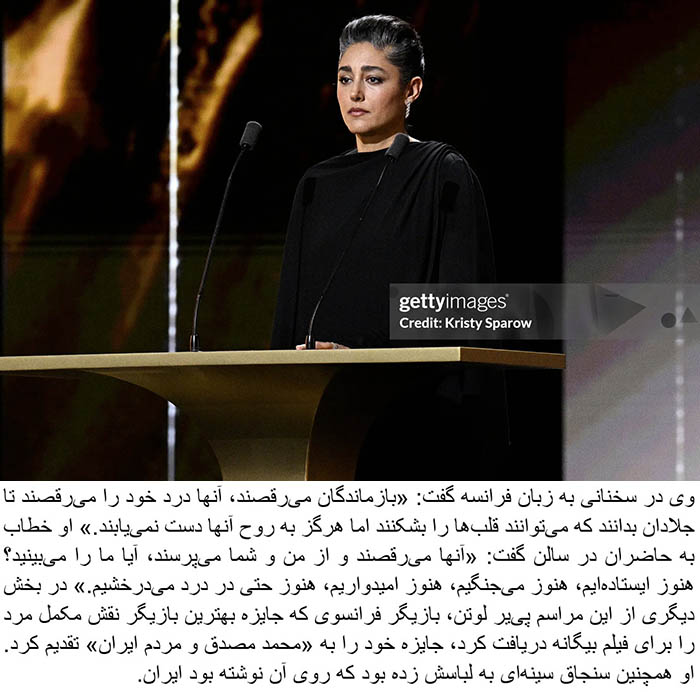 Golshifteh Farahani, the star of the night, was the center of attention following her speech. Her appearance in the ceremony was her first after her outspoken remarks, and her presence sparked widespread discussion.