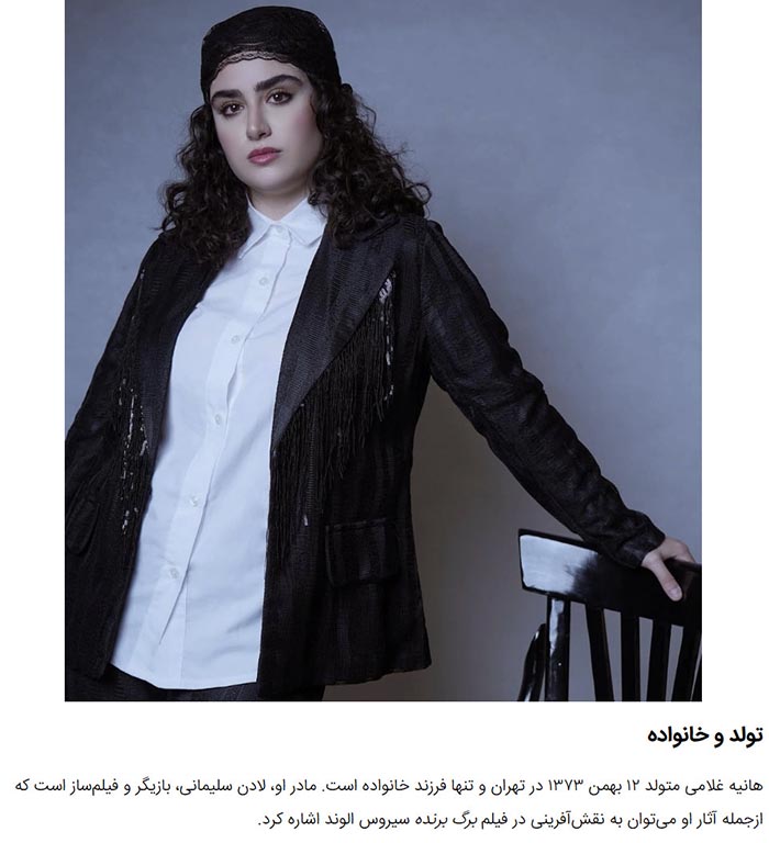 Hanieh Gholami was born on February 1, 1994, in Tehran, Iran. She is the only child of her family. Her mother, Ladan Soleimani, is an accomplished actress and filmmaker. Ladan Soleimani has contributed to Iranian cinema with her acting roles, including her part in the acclaimed film The Winning Card directed by Cyrus Alvand.