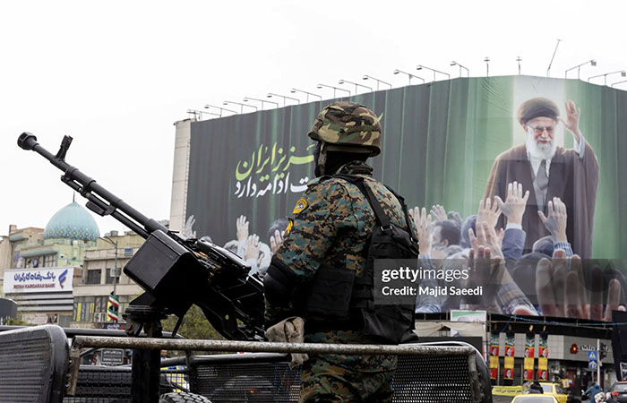 The display of Iranian flags and revolutionary symbols reinforces the idea of collective resilience.