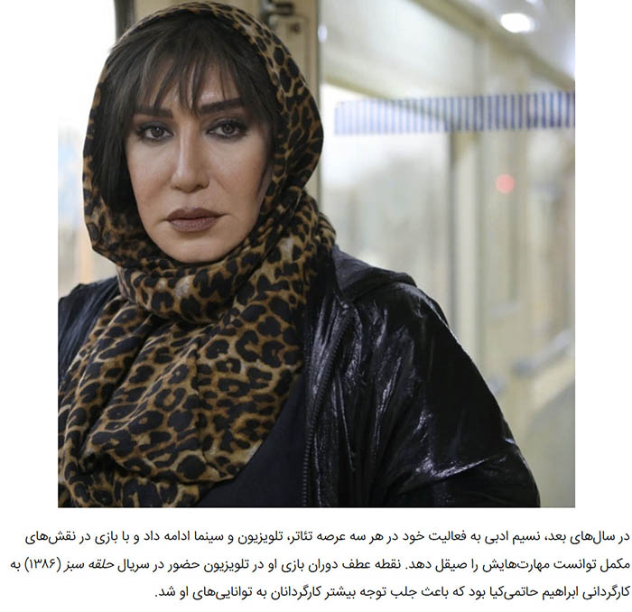 Nasim Adabi made her television debut in 1999 at age 20, starring in the series “Twins”, directed by Hormoz Hedayat. Her performance in this series garnered attention and helped establish her presence on Iranian television.