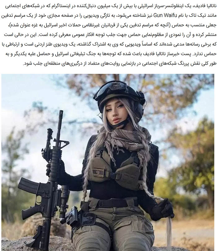 Her bold presence, often characterized by military uniform photos, seductive content, and outspoken opinions on Hamas, has made her a controversial figure, emblematic of the intersection between entertainment militarism and propaganda war in the digital age. As a member of the Alpha Gun Angels, an organization that promotes the Israeli military as a glamorous lifestyle, Fadeev exemplifies the trend of military influencer marketing.