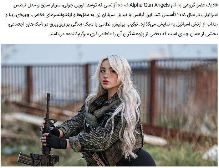 She is part of the Alpha Gun Angels, an organization founded in 2018 by Orin Joly, a former Israeli soldier and fitness model. The group’s mission is to promote the Israeli military as a glamorous and attractive lifestyle, turning female soldiers into military models and social media influencers. This strategy is part of what some scholars call “entertainment militarism,” where military service is intertwined with celebrity culture and entertainment.