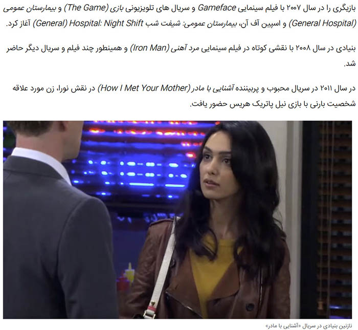 Nazanin Bonadi’s acting debut in 2007 with Gameface marked the beginning of a dynamic career. She appeared in popular TV series like The Game, General Hospital, and had a brief role in the Marvel blockbuster Iron Man (2008). Her role as Nora in How I Met Your Mother (2011) gained her recognition among American audiences.