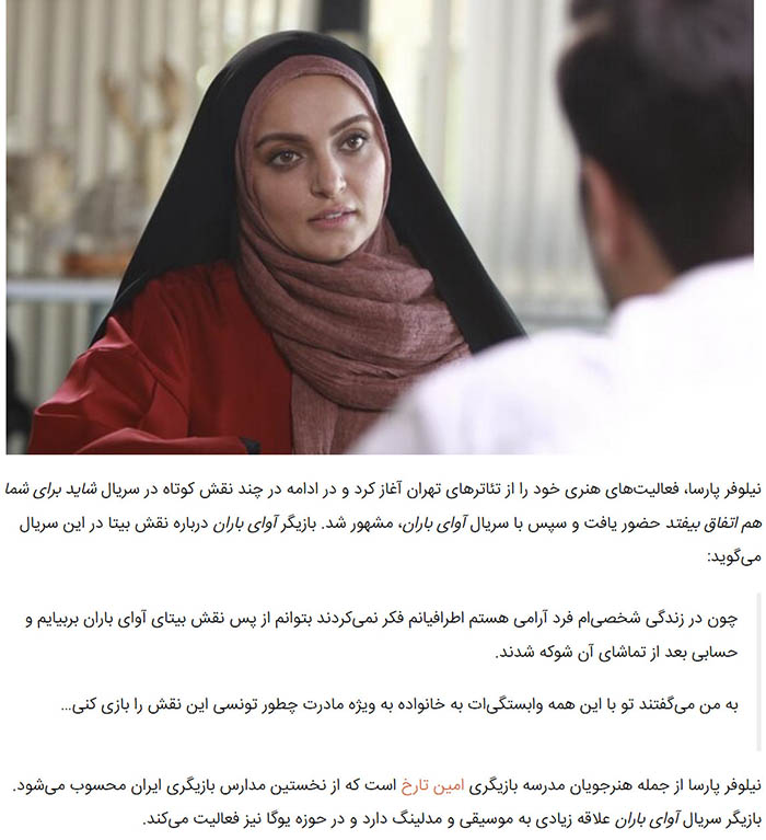 Niloufar Parsa is a graduate of Amin Tarakh Acting School, one of Iran’s most reputable acting institutions. Her training there equipped her with essential acting techniques and helped her build confidence for her future roles in television and cinema.
