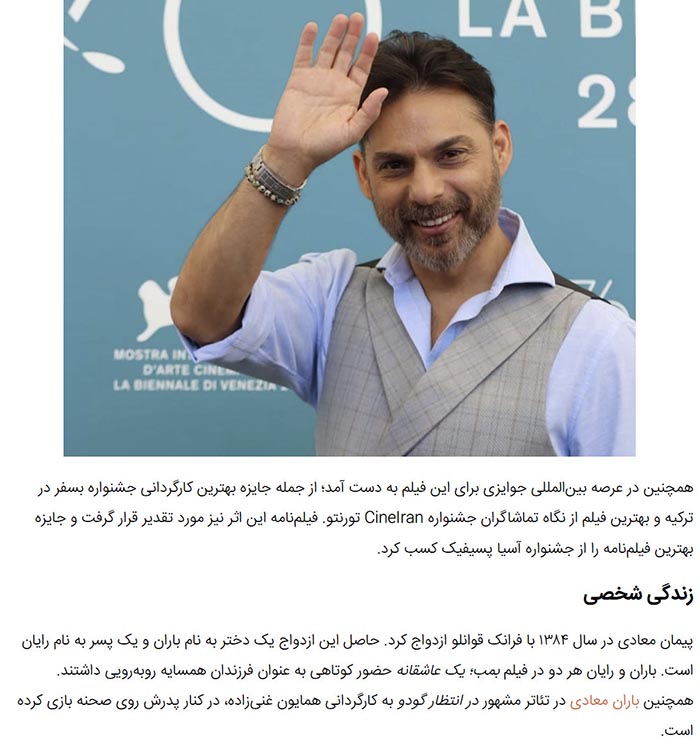 Peyman Maadi married Frank Ghavanloo in 2005. They have two children, Baran and Rayan. Both children have shown interest in acting, with Baran participating in stage plays alongside her father, notably in Waiting for Godot. Their family life remains private, but Maadi often shares moments with his family on social media.