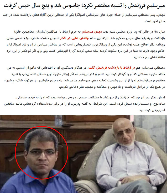 The son of Mustafa Mirsalim, a senior conservative politician and former presidential candidate, was sentenced to prison after being accused of collaborating with the MEK (People’s Mojahedin Organization), a designated terrorist organization by Iran. This case highlights Iran’s ongoing campaign against opposition groups and how family members of political figures are often caught in the crossfire of internal security measures, with accusations of involvement in anti-regime activities.
