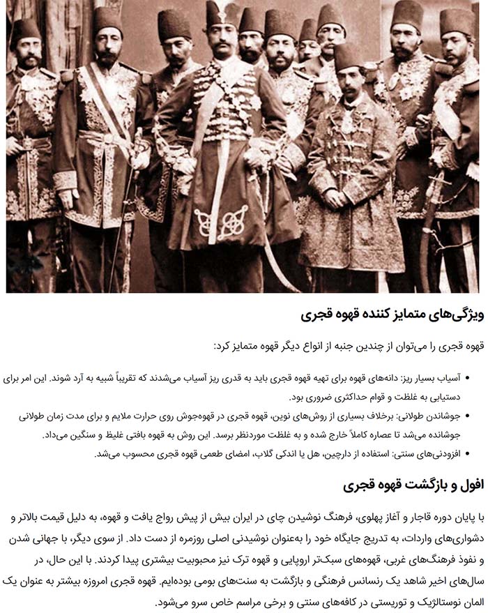 Qajar coffee is more than just a traditional beverage — it is a symbol of Iran’s cultural heritage, courtly elegance, and social customs. Its unique preparation, ceremonial serving rituals, and literary significance highlight the depth of Iran’s history and the rich tapestry of its social fabric.