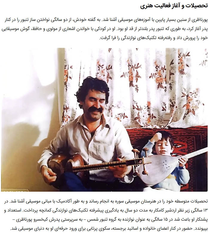 At age 13, he dedicated two years to mastering the Kamancheh under the mentorship of Ardeshir Kamkar, a master musician and member of the renowned Kamkar family. His perseverance and natural talent allowed him to quickly progress, ultimately becoming proficient in playing multiple traditional instruments, including the Tanbur and Setar.