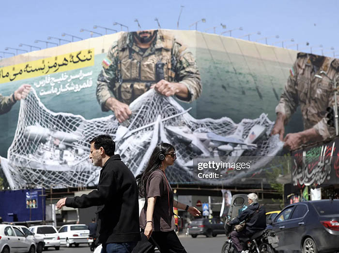 Despite escalating tensions, daily life in Tehran continues with a striking contrast between routine normalcy and intense political messaging. Commuters walk past massive propaganda posters, including the now-famous banner in Enghelab Square, as they go about their everyday activities.