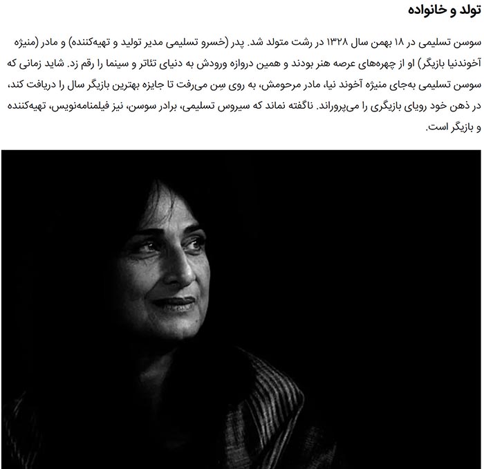 Born on February 8, 1949, in Rasht, Iran, Susan Taslimi entered a family deeply rooted in the arts. Her father, Khosro Taslimi, was a renowned production manager and producer, and her mother, Manijeh Akhundnia, was a celebrated actress. Growing up in such an environment, Susan was exposed early to the world of theater and cinema.