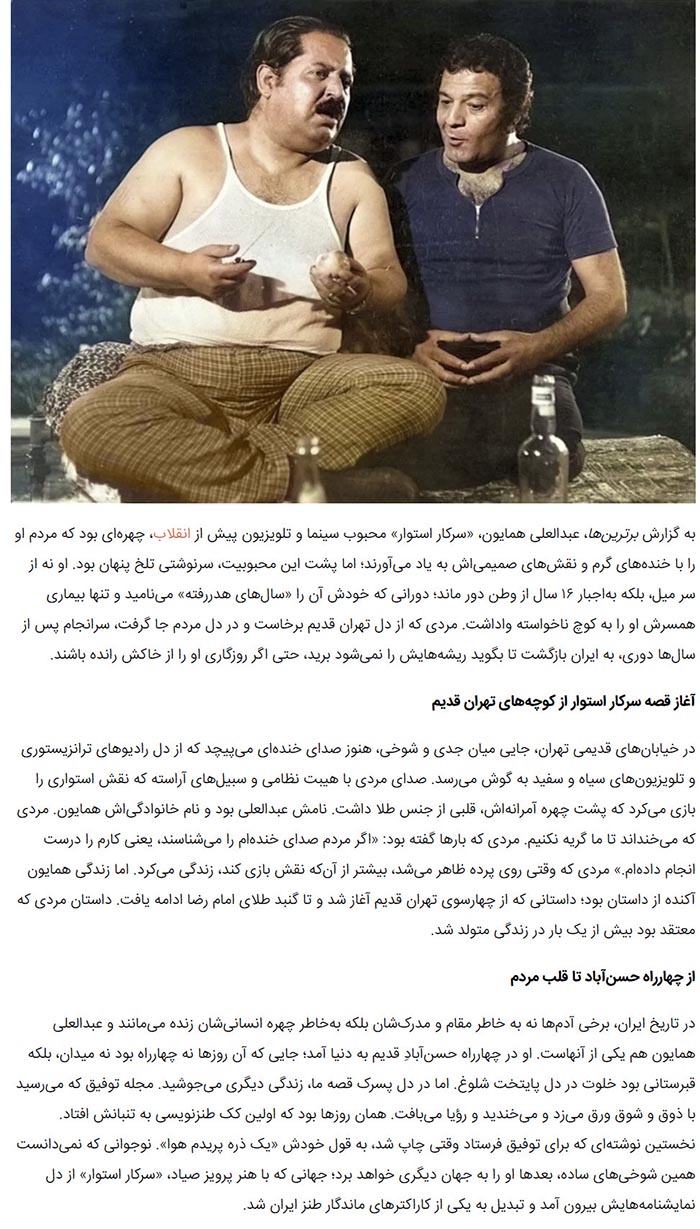 Abdol Ali Homayoun, affectionately known as “Sarkar Estovar,” remains one of the most beloved figures in Iranian cinema and television history. His warm laughter, humorous roles, and deep connection with the Iranian people have cemented his legacy as a cultural icon. This article explores his inspiring life story, his rise in the entertainment industry, and the enduring impact of his work.