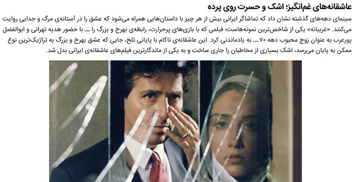 “Ghoribaneh” (1970s), featuring Hedeyeh Tehrani and Abolfazl Pour-Arab, depicted a tragic love story between Behrokh and Bozorg. It was a film that made audiences cry, showcasing love on the brink of death and separation. The film’s raw emotion and poetic storytelling made it one of the most memorable romantic Iranian films of its time.