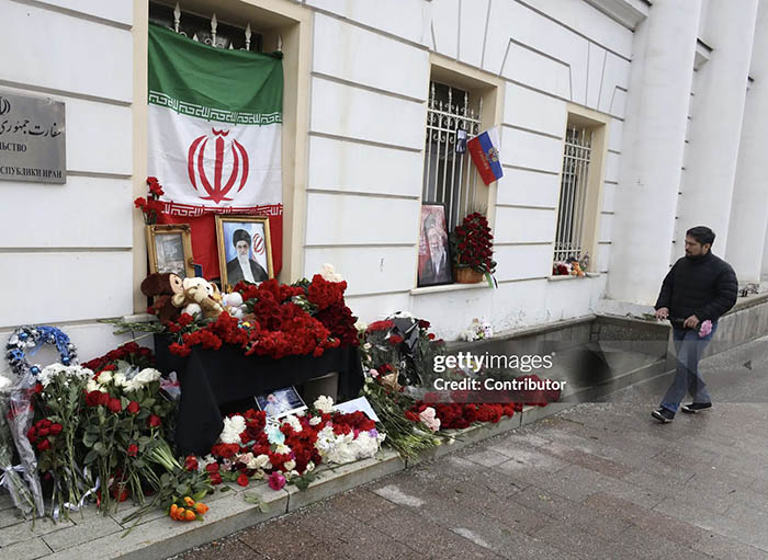 The memorial outside the Iranian Embassy in Moscow signals the emotional and symbolic dimension of diplomatic relations during crisis moments.