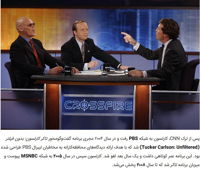 Carlson then hosted Tucker Carlson: Unfiltered on PBS in 2004, aiming to present conservative viewpoints to a liberal audience. The show was short-lived, canceled after a year. He later hosted The Tucker Show on MSNBC from 2005 to 2008, gaining further exposure as a conservative commentator.