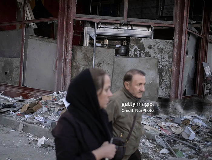 Photographic coverage from Getty Images, NurPhoto, and Anadolu documented shattered storefronts, exposed residential interiors, and civilians navigating debris-filled streets.