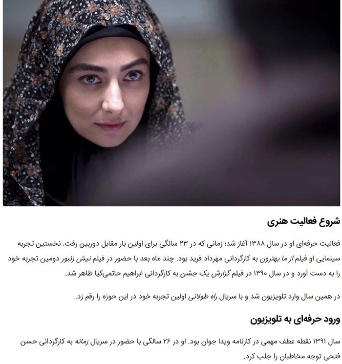 Vida Javan’s professional actings began in 2009 at the age of 23. Her first appearance on screen was in the film “Better Than Us”, directed by Mehrdad Farid. She also featured in “Nish Zanbour” and “Report of a Celebration” (directed by Ebrahim Hatamikia). These initial roles helped her gain recognition in Iranian cinema.