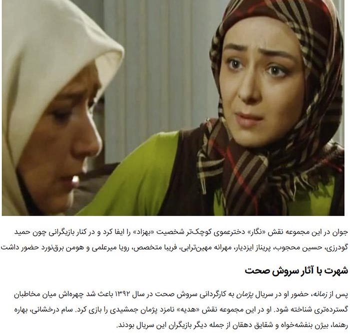 The year 2012 was a pivotal moment for Vida Javan’s career. Her role as Negar in the popular Iranian TV series “Zamaneh” directed by Hassan Fathi garnered widespread acclaim. Playing the young cousin of the main character, she captivated viewers with her compelling performance and natural acting style.
