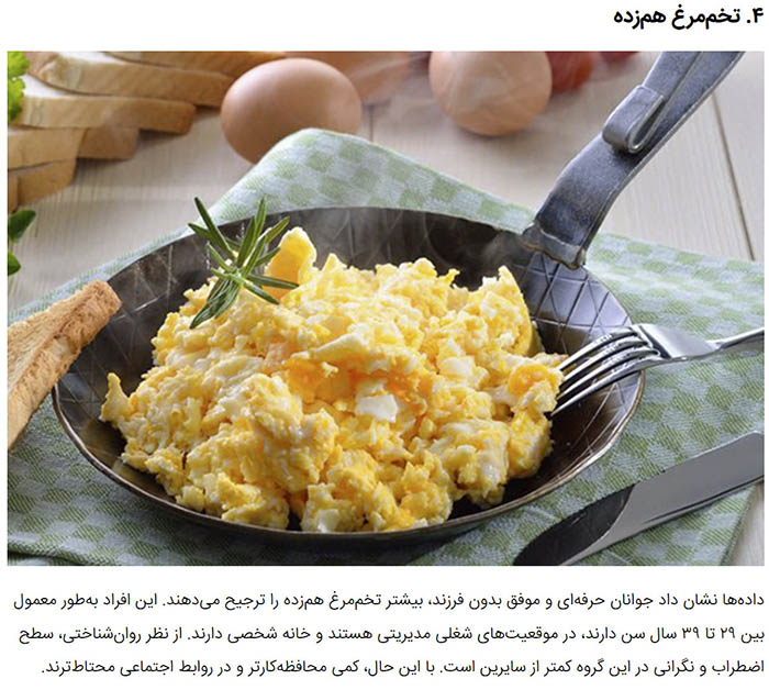 Scrambled egg lovers are usually men working in technical or specialized fields. They tend to be open to new experiences, have diverse interests, and possess a rich inner life.